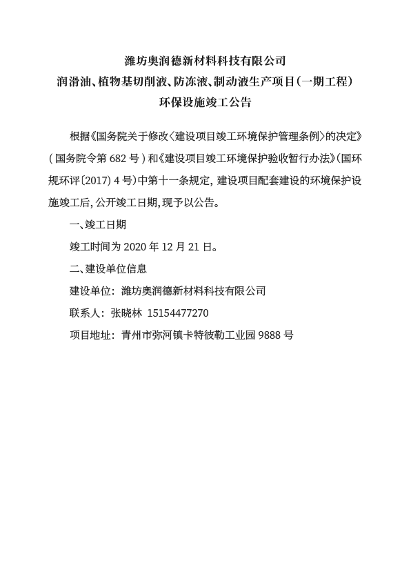 濰坊奧潤德環(huán)保設(shè)施竣工公告