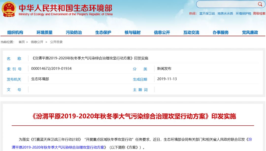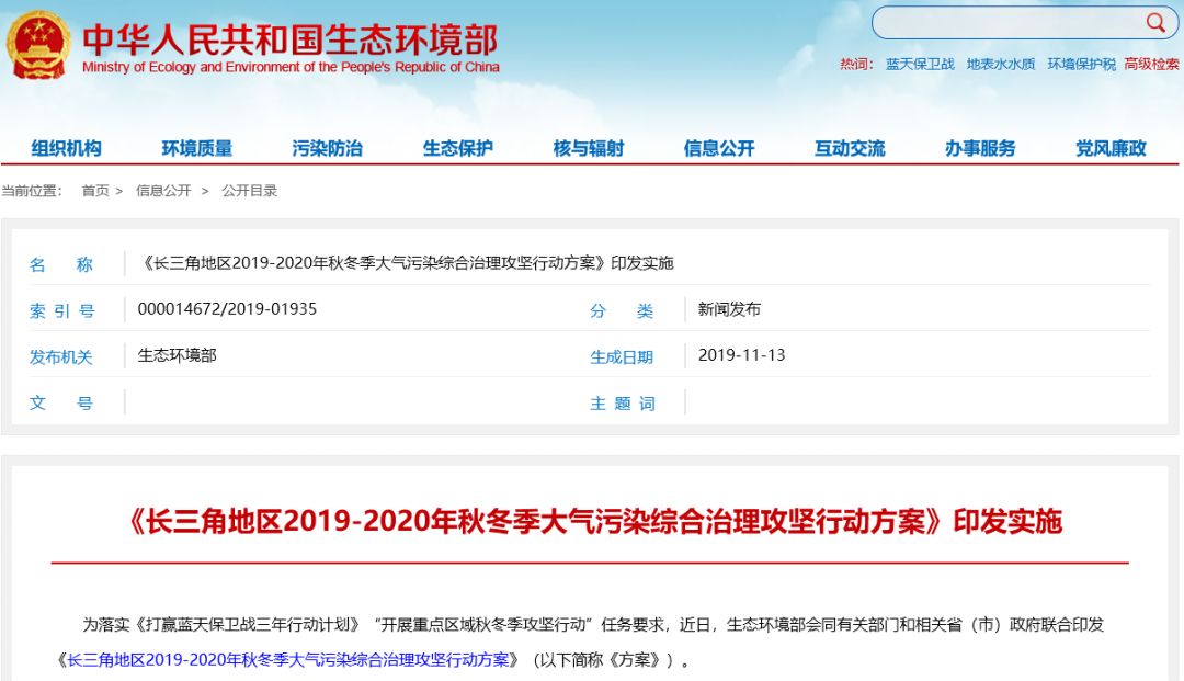 11月13日,國家生態(tài)環(huán)境部印發(fā)實施了《汾渭平原2019-2020年秋冬季大氣污染綜合治理攻堅行動方案》和《長三角地區(qū)2019-2020年秋冬季大氣污染綜合治理攻堅行動方案》。